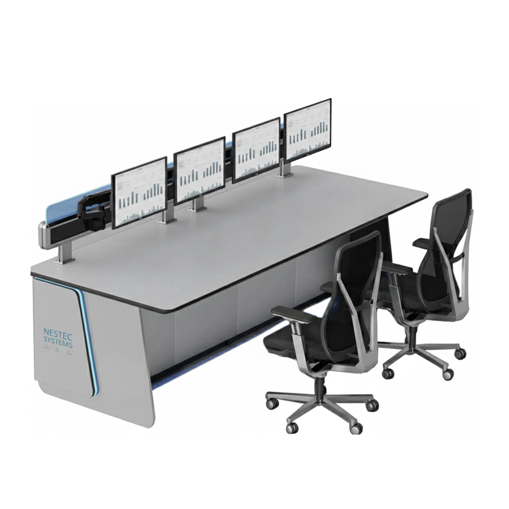 The NK24 series is an ergonomically optimized control desk table system. The control room table is made of anodized aluminum components. NESTEC control consoles take into account all aspects of ergonomics (ISO standard) and cable management, including PDU, ventilation system and NES ERGO monitor holder systems.